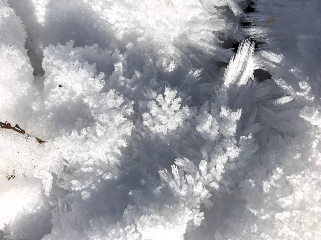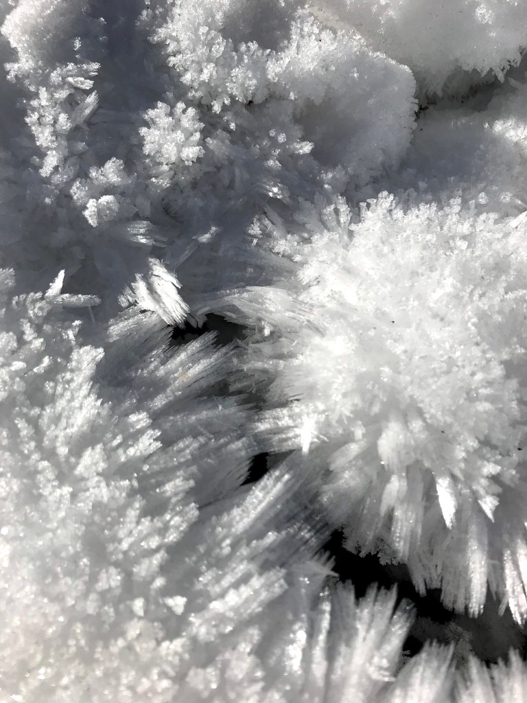 Where the path crossed the stream (or where it seemed to be crossing the stream; the farther I went, the less obvious it was as to where the path was hidden under the snow), the snow on it froze in the most interesting ways, creating tiny crystal ‘caves’.