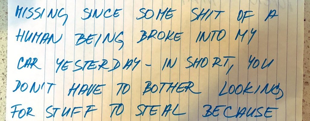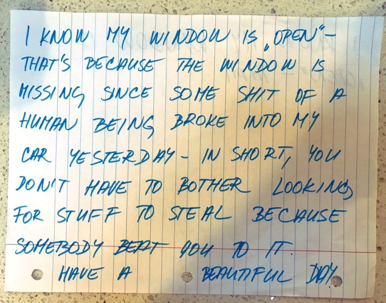 - I understand that sometimes, circumstances could lead one to those desperate acts. If I’m to give you the biggest advantage of doubt, I’d say I’m not even mad at you anymore – I WOULD say that if it weren’t for the hell I’m going to go through at the DMV. But let me ask you one question – if you were so desperate, how come you can afford a pickup truck? Yes, you’ve been seen “hurrying” away from the trailhead. And why would you choose to steal stuff from such an old car as mine? Believe me, if I was at least as rich as to be able to spare those $60 you took away from me, I would upgrade to something that doesn’t look like it’s going to break down the very next mile. Why would you expect to find a lot of money or expensive electronics in such a car?