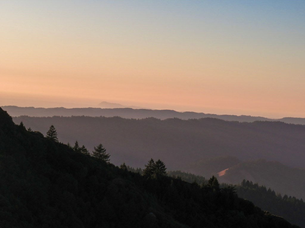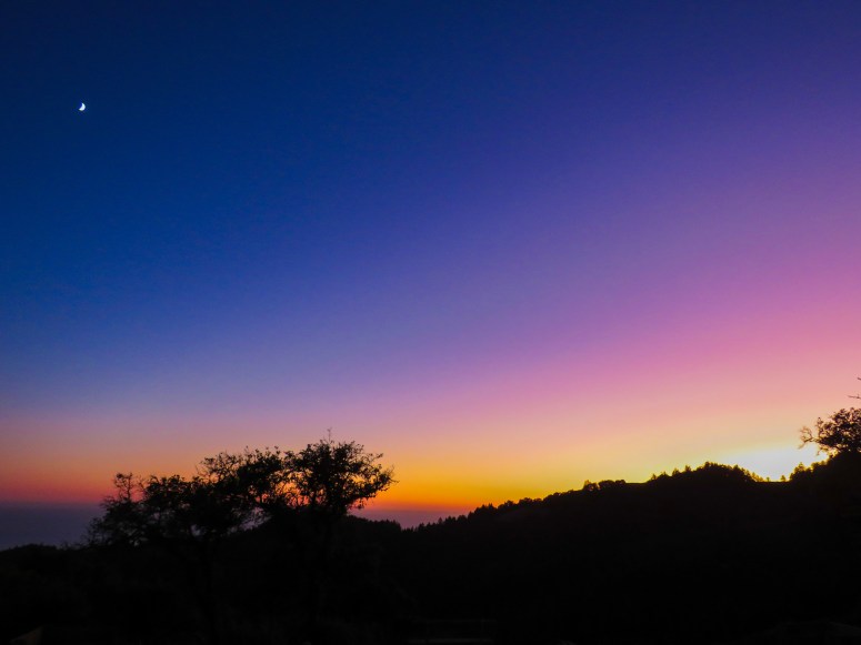 The dark caught up with us halfway down the mountain. The last bits of light departed as the sky got pitch black in the east and kept a faint glow in the west. The deep blues and purples in between were as calming as the strong orange near the horizon was riveting. We said goodbye to those last pieces of light and let the dark resting among the trees swallow us up.