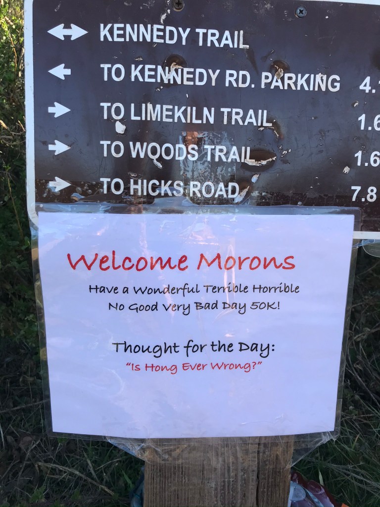 Once a year, this trail hosts a no-aid stations, no-support, and no-nonsense race called Terrible, Horrible, No Good, Very Bad Day. Dogmeat is the sole focus of this race. You go up and down on repeat until you can’t go no more, and then you go up and down again. For 50 kilometers (31 miles), which is 10 repeats. You can also opt out to do the “fun run,” which is what I did. “Fun run” means you go up and down “only” 5 times; a 30K (18 miles) race.