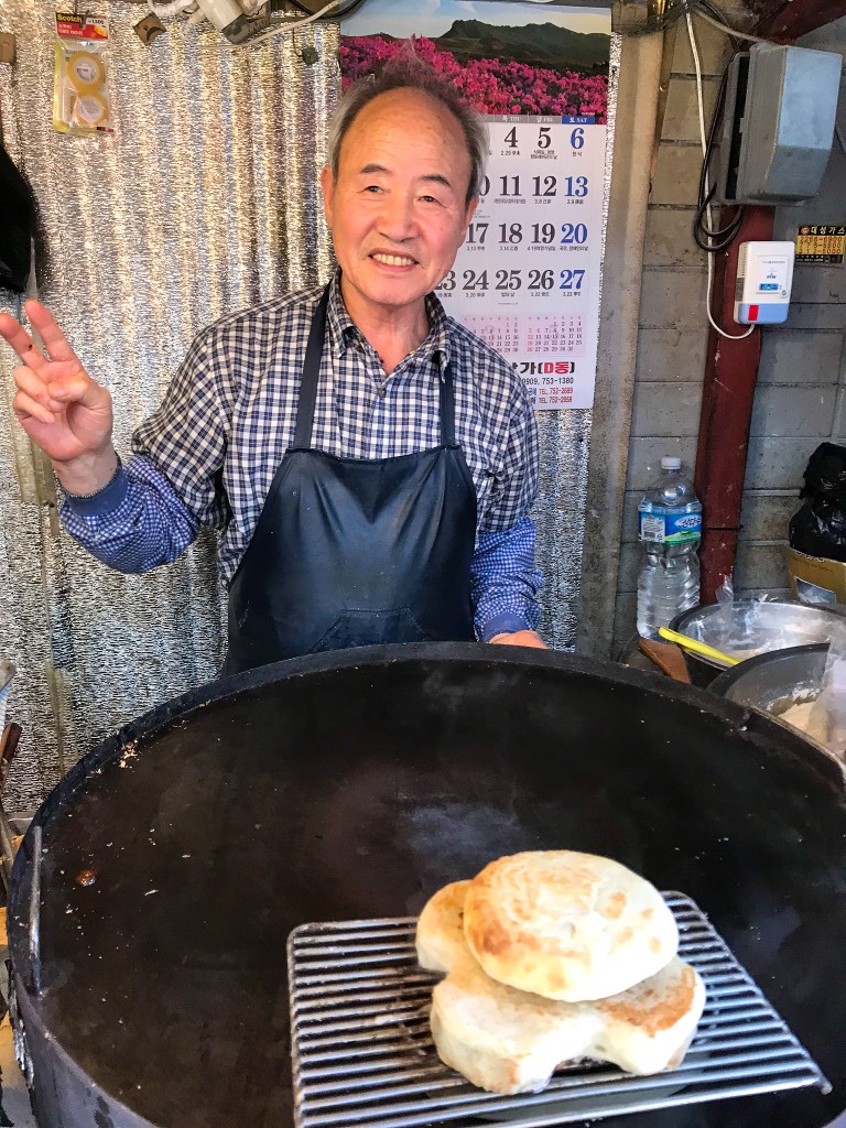 And tasted even better. The warm filling exploded in my mouth and tasted like sun itself, while the wheat pancake felt like clouds on my tongue. I know this sounds quite dramatic, but I have no better way to describe it. The man who made my hotteok saw my expression and started to laugh, saying something I couldn’t understand. I could only repeat over and over “This is delicious!” which is one of the very few things I knew how to say, and he nodded frantically while telling his wife that the “white girl” loved the hotteok. I thanked them profoundly for the great food and asked if I could take a photo of them cooking. The man gave me peace sign, we said goodbyes, and I have had dreams about their hotteok ever since.