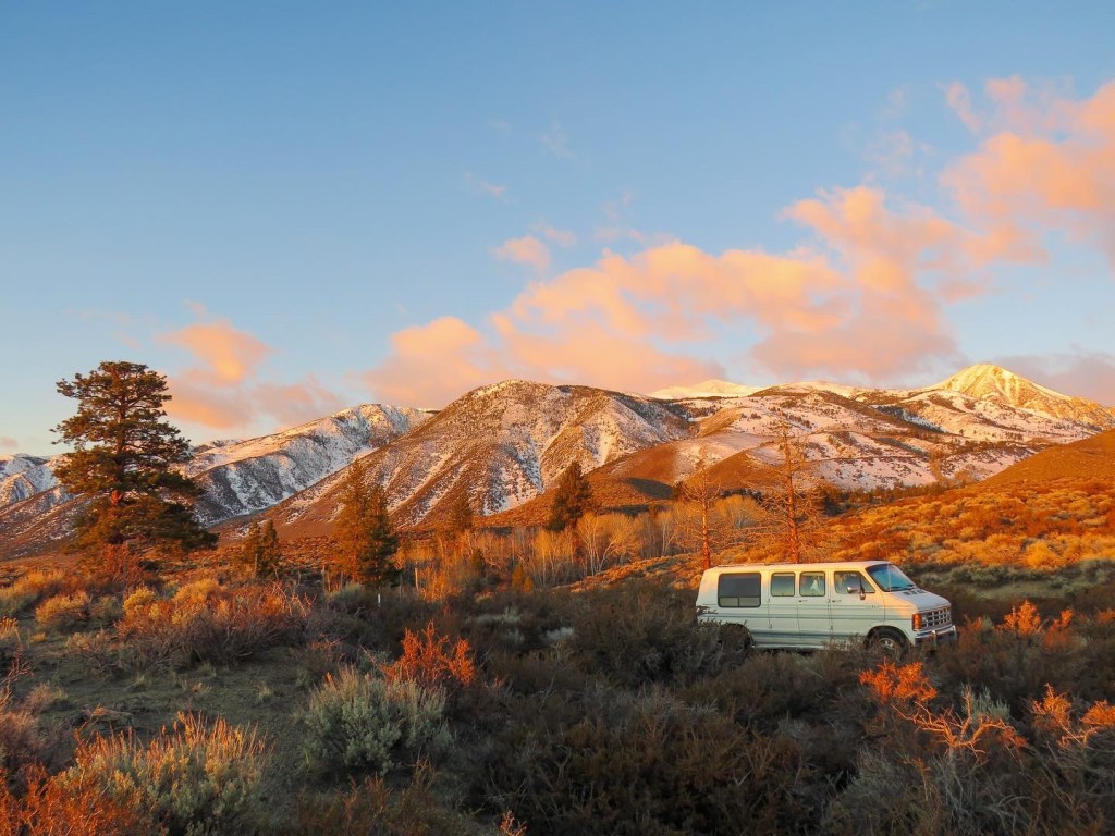 I crossed the pass that HWY 395 winds through to get to Lee Vining from the north just as the sun set. It was windy but not too cold, given the time of the year. I found a place that would become my home for the next few nights near Mono City. It was a beautiful spot with a view of the mountains in the west, so close it felt like I could just reach my hand and touch them, and Mono Lake to the east, which I could see if I climbed on top of the van named Betsy, an old Dodge from the 80’s.