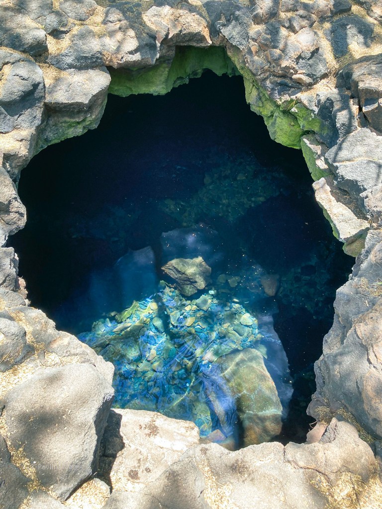The ‘architecture’ of the alluring Queens Pond allows for the sunrays that find their way into the lave tube to reflect back in a beautiful dance, making the unbelievably blue water look as if it was emitting light of its own.