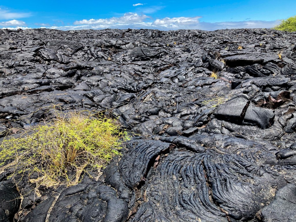 Pahoehoe lava is smooth and ropey and lacks the vicious sharpness of a’a lava when cooled. However, before it cools, it’s much more dangerous than its callous-looking cousin. Pahoehoe lava owes its smooth appearance to its higher temperature, and, therefore, lower viscosity when it’s ejected from the ground. One might outwalk the slowly-creeping a’a lava, however, one most certainly will not outrun the fast-flowing pahoehoe lava.