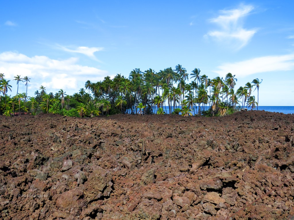 The trail reappeared for a short time after we left the sandy beach only to disappear completely once we hit an extensive lava field. This time, it was pahoehoe lava; much easier to hike on and much less likely to hurt us.