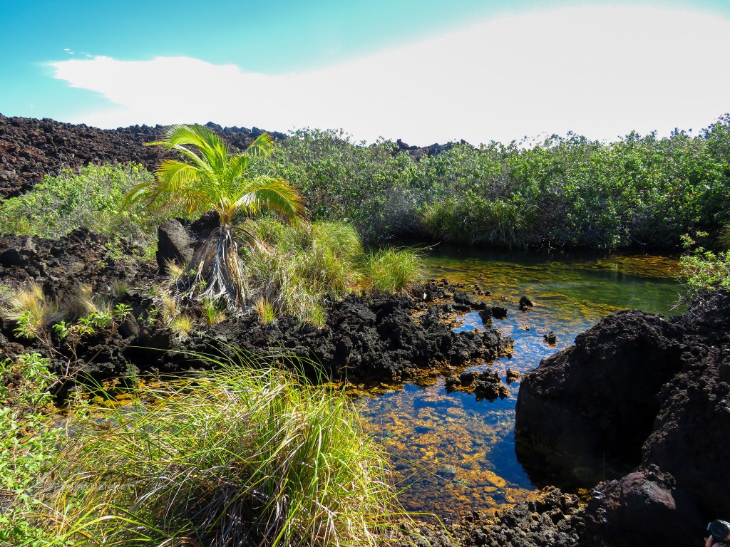 The “pond” is actually an old lava tube that connects to the ocean under the ground. The ceiling of the tube collapsed in two places, the tube itself filled with ocean water, and now it looks like a swimming hole from dreams; however, signs at the trailhead warn against taking a dip. If you pay a visit to this beautiful place, please be thoughtful, heed the signs, and treat the place with respect.