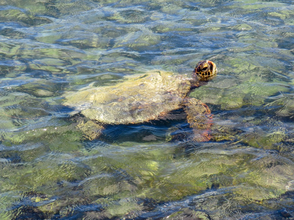 I saw a sign on the small peninsula on the other side of the bay and, curious about what it said, asked Mao if he wanted to join me on a swim across the water. Koa joined us, too, and together, we made our way to the rocky peninsula. It wasn’t exactly a short distance but it was very well worth it, as, on the other side, we found another Hawaiian green sea turtle sunbathing on the rocks. The sign itself warned about giving the turtles the space they deserved. We kept our respectful distance not to disturb the turtle and soon decided it was time to swim back, as the clouds started to collect on the horizon and the wind picked up, raising the waves a little higher.