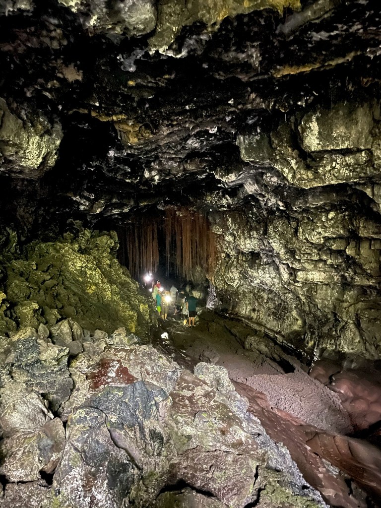 If you bring a headlamp, the algae that grow on the walls of the lava tube will put on a beautiful show. It looks as if the walls themselves were emitting silver and gold light. As there was another group of visitors in the cave, their lights combined with ours reflected off the algae which lit up the whole space.