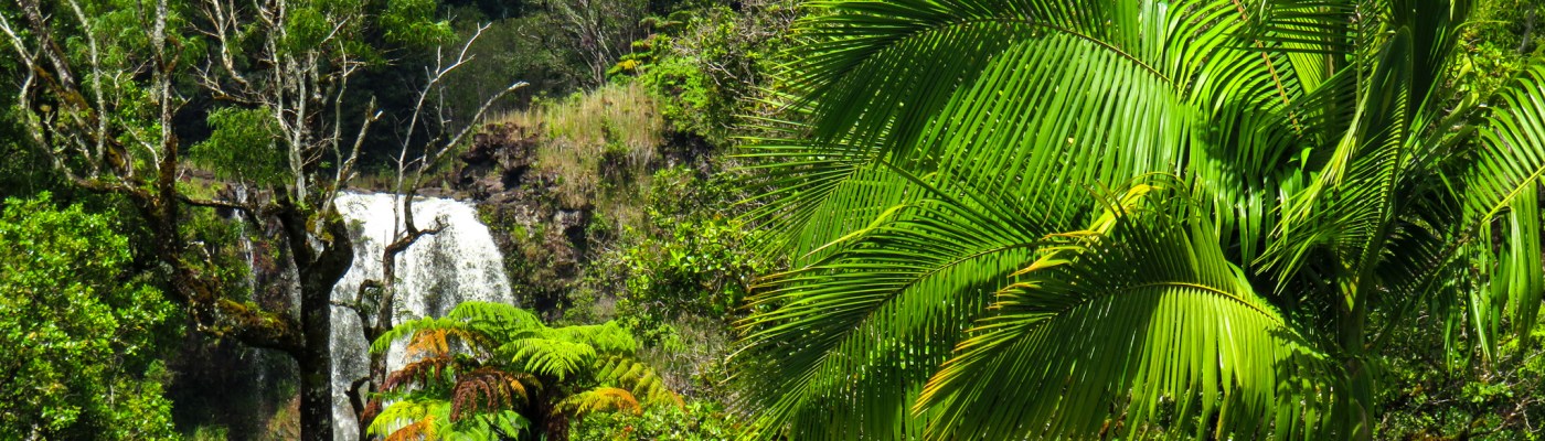 We glimpsed the waterfalls over the tops of palms and other trees soon and started to crawl down the short rocky descent, entrusting our safety to the hands of our friends as we helped each other down right next to the river. On a lip right next to the water, we left our backpacks with Ihi and got into the cold water. The river, having meandered through deep gorges in the shade of the rainforest, was much colder than the ocean.