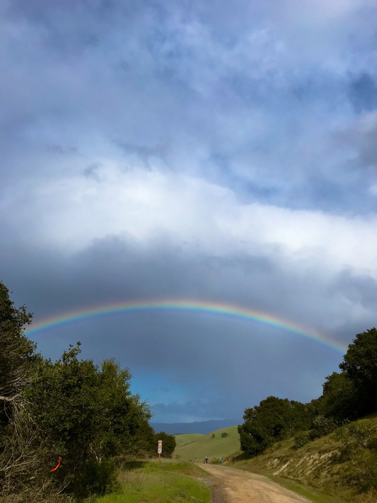 We got one rain-free hour and a pretty rainbow mid-day Saturday before our aid station was literally blown away and we had to go chase the food and the tent a mile down the trail. We had to hand food out of our cars after that.