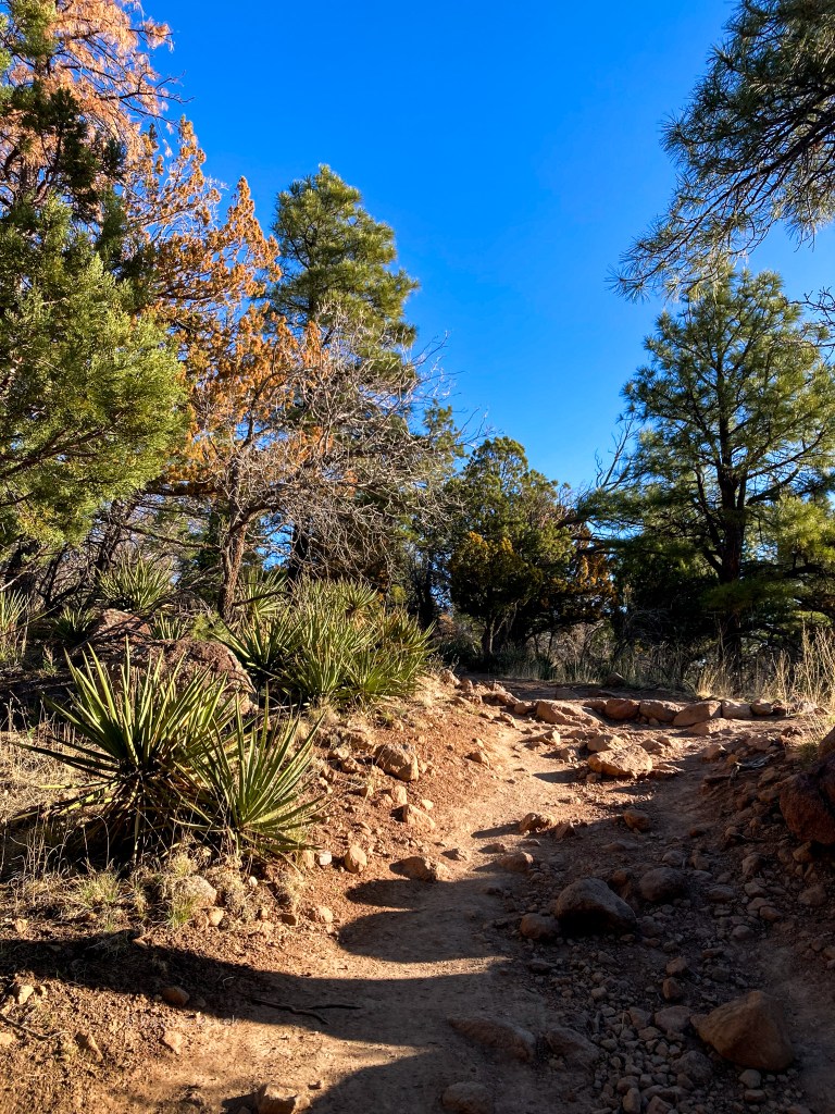 The trail was smooth and fun at the beginning. Knowing it wasn’t too far to the top, I opted to leave water in the car and grab only a jacket—there was still snow on the top. I soon left the cover of the thin growth of pines and rounded past a few cacti—the fun had begun.