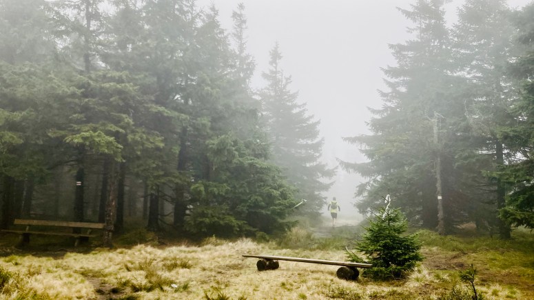 I ran past a few lumberjacks and soon, another long climb followed. As I ascended towards the cloudy sky, I got, once again, surrounded by the fog that was way too eager to embrace me in its arms and never let go. I spent several next hours running along the border without seeing a single human being—or anything for that matter. The fog, stirred by the wind, rolled over the ridgeline in angry waves, isolating me from the rest of the world as rain periodically pelted my body.