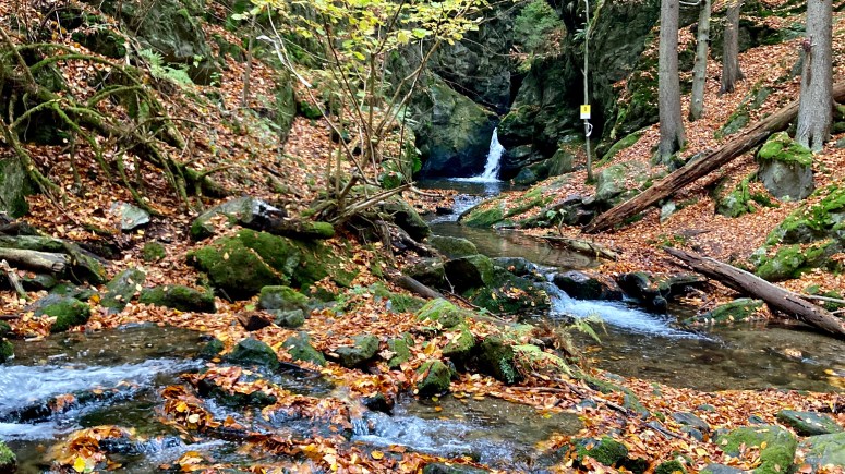 Blue ribbon marked a 1.5-mile long stretch down the steepest thing they managed to find in the whole of Rychleby mountains. Forget trails; forget deer trails. Even the animals have more brains about them than to go down that thing. At mile 28 (yes, past the marathon mark!), crawl along rock ledges and under fallen trees, slide through the autumn foliage, dislodge rocks and watch them run away from you, unstoppable on the steep slope. Don’t even think about trying to film it. Instead, hold onto dear life as you make your way down the surprisingly incredibly well-marked route.